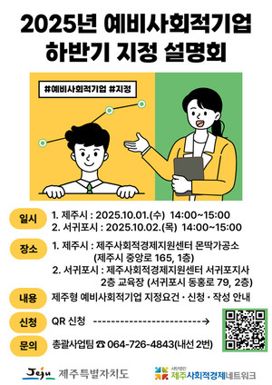 제주특별자치도가 사회적기업 육성을 위해 올해 두 번째 예비사회적기업 지정에 나선다. 도는 9월 29일부터 10월 21일까지 '2025년 제2차 제주형 예비사회적기업 지정 계획'을 공고하고, 10월 1~2일 설명회를 연다.대상은 사회적 목적과 영업활동 요건을 갖췄으나 수익구조 등이 미흡한 기업으로, 지정 시 재정·경영·판로 등 초기 지원을 받을 수 있다.설명회는 ㈔제주사회적경제네트워크 주관으로 제주시(10월 1일)와 서귀포시(10월 2일)에서 열리며, 신청은 9월 30일까지 전화(064-726-4843) 또는 QR코드로 가능하다.김미