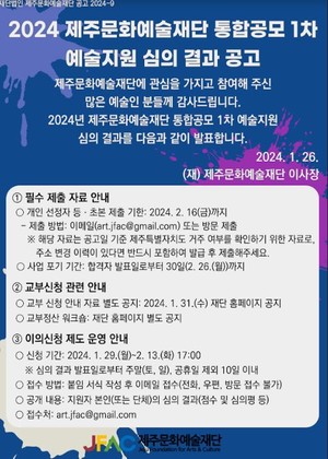 제주문화예술재단은 2024년 통합공모 1차 심의를 마치고 3개 분야 12개 사업 431건에 대한 총 37억550만원의 지원금을 확정했다고 30일 밝혔다.예술 지원 분야 사업 건수 및 지원액은 예술창작활동 280건 21억1140만원, 원로 예술인 활동 7건 7000만원, 예술창작과 발표 공간 5건 50000만원, 공연장 상주 단체 육성 6건 4억2000만원, 청년 예술활동 22건 1억4500만원이다.문화예술교육지원 사업은 유아 문화예술교육 지원 3건 7500만원, 꿈다락 문화예술학교 9건 1억7700만원, 전 생애 문화예술교육 지원