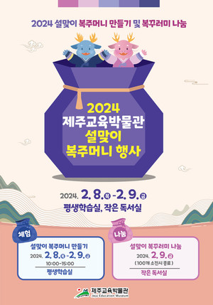제주교육박물관은 오는 8일부터 9일까지 '2024년 설맞이 복주머니 만들기, 복꾸러미 나눔 행사'를 개최한다.복주머니 만들기 체험은 정월 초하루(음력 1월 1일)에 한 해 동안 복을 비는 의미로 어린이에게 매어 주던 복주머니를 만든다. 체험 시간은 오전 10시부터 오후 3시까지다. 장소는 박물관 평생학습실이다.전예린 기자