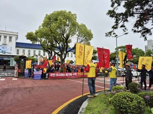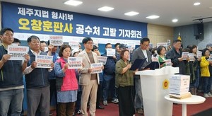 제주지역 시민단체가 재판 과정에 위법이 있었다며 현직 제주지법 판사에 대한 고발에 나섰다.공안탄압 저지 및 민주수호 제주대책위원회는 21일 오전 제주도의회 도민카페에서 기자회견을 열고 제주지법 제1형사부 A부장판사를 직권남용과 법원조직법 위반 협의로 고위공무원범죄수사처에 고발한다고 밝혔다.이들은 "제주에서 태어나고 살아 온 50대 여성 농민과 여성 비정규직노동자를 가혹하게 구속, 감금한 제주지법 A판사의 위법하고 부당한 판결 사건을 더이상 묵과할 수 없어 이를 고발하게 됐다"고 주장했다.그러면서 "며칠 전 서부지법 폭동사태를 저질렀