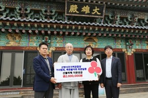 산방사, 성금 200만원 기탁거사림회·목련불자회 동참산방사(주지 벽공)와 거사림회(회장 고동수), 목련불자회(회장 임정순)는 최근 산방사에서 산불 피해 지원을 위한 성금 200만원을 제주사회복지공동모금회(회장 강지언)에 기탁했다.이번 성금은 지난 13일 열린 '제18회 나누는 효심 함께하는 경로잔치' 수익금 중 일부로 산불 피해 지역의 복구와 이재민 지원 등 일상 회복을 위한 현장에 전액 사용될 예정이다.산방사 주지 벽공 스님은 "산방사 신도들의 봉헌으로 더욱 뜻깊은 경로잔치가 돼 감사하다"며 "영남 지역의 산불 피해를 입은 주민들