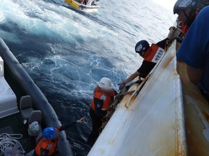 13일 오후 동중국해 해상에서 침수된 제주 모슬포 선적 근해연승어선 887어진호(29t) 선원들이 해경에 인계돼 제주로 돌아오고 있다.14일 제주해양경찰청에 따르면 887어진호 선원 8명은 지난 13일 오후 8시20분께 중국 해경에 의해 구조됐다.구조된 선원들은 현재 제주 해경 경비함정에 인계돼 제주로 복귀 중이다.승선원은 한국 국적 선장 1명과 인도네이사 국적 선원 7명 등 총 8명이다.선원들은 모두 건강이 양호한 상태로, 병원 이송 등 여부는 아직 결정되지 않았다.현재 887어진호는 지속된 침수로 기울기 60도 정도로 떠 있는
