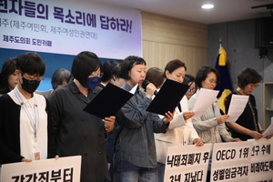 제주 노동단체가 제21대 대통령 선거를 앞두고 정치권에 노동자 기본권 보장을 요구했다.민주노총 제주지역본부는 13일 오전 제주도의회 도민카페에서 대선요구안 및 지역요구안 기자회견을 열고 "노동자와 시민이 내란에 맞서 민주주의를 지켰다. 이제 모두가 존엄 있고 평등한 삶을 누릴 수 있는 민주주의 세상으로 나가자"고 주장했다.이들은 "윤석열 집권 기간 자본 독재, 검찰 독재로 화물연대와 건설노조를 비롯한 수많은 노동자가 억압과 착취로 고통받았다"며 "윤석열이 아니더라도 지난 수십 년 신자유주의가 초래한 비정규직 양산과 불평등 양극화로