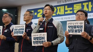 세계 산재 노동자의 날을 맞아 제주지역 노동자들이 산재 사망자를 기리고 노동자의 건강권 보장을 촉구했다.민주노총 제주지역본부는 28일 오전 제주도의회 도민카페에서 기자회견을 열고 작업 중지권 쟁취와 안전한 일터를 요구했다.이들은 "오늘 산재 노동자의 날이 국가기념일로 제정된 해"라며 "그러나 매년 2400명의 노동자가 일터에서 죽고 부상과 질병으로 15만명의 고통받는 산재 사망 1위 산재 공화국이다"고 했다.그러면서 "남발되는 산재 불승인, 200일, 300일이 넘는 산재처리 기간, 턱없이 낮은 간병 급여, 치료도 재활도 사업장 복