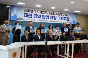 오는 6월 3일 제21대 대통령 선거를 앞둔 가운데 제주 36개 단체가 후보들을 향해 '제주 기초자치단체 도입을 위한 주민투표 실시'를 공약에 반영해 달라고 촉구했다.제주 기초자치단체 도입을 위한 도민운동본부는 30일 오전 제주도의회 도민카페에서 기자회견을 열고 각 후보들을 향해 제주형 기초자치단체 도입을 위한 공약을 반영할 것을 촉구했다.이들은 "2006년 7월 제주특별자치도가 출범하면서 기존 4개 시군이 폐지되면서 제주에는 기초자치단체가 없다"며 "제주의 최대 현안 중 하나는 행정체제 개편이다"고 했다.그러면서 "기초자치단체가