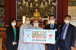 제주불교연합회연등축제위원회(위원장 허운스님)는 최근 제주시 탑동광장에서 대한적십자사제주특별자치도지사(회장 오홍식)에 경북·강원지역 산불피해 지원을 위한 성금 500만원을 기탁했다.이번 성금은 불기 2566년 부처님 오신 날을 기념해 열린 문화행사와 제주불교연합회 신도회원들이 모아 마련한 것으로, 이재민 지원과 재난현장 구호활동 등에 사용된다.허운스님은 "다시 희망이 꽃피는 일상으로 복귀를 앞두고 열린 연등축제를 계기로 신도들이 함께 성금을 모금했다"며 "갑작스러운 화마로 일상을 잃고 힘든 시기를 보내는 이재민분들에게 도움이 됐으면