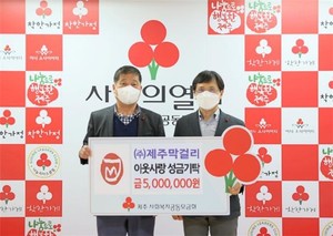 ㈜제주막걸리(대표 고동윤)는 지난달 29일 제주사회복지공동모금회(회장 강지언)를 방문해 도내 취약계층을 위해 사용해 달라며 성금 500만원을 기탁했다.고 대표는 "제주막걸리에 뜨거운 사랑을 보내주신 많은 도민분에게 보답하고 싶었다"며 "성금이 주변 어려움을 겪고 있는 이웃에게 보탬이 됐으면 한다"고 말했다. 홍진혁 기자