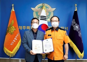 맨몸으로 바다에 빠진 아이를 구조한 제주시민이 소방청 119 의인상을 수상했다.제주소방서(서장 고재우)는 지난달 29일 119 의인상을 수상한 강동엽씨(58)와 티타임을 갖고 감사함을 전했다고 3일 밝혔다.119 의인상은 재난·사고 현장에서 위험을 무릅쓰고 타인의 생명을 구한 이들의 정신을 기리고 예우하기 위한 상이다.강씨는 지난 3월 27일 오전 강한 바람과 파도가 일던 제주시 용담1동 동한두기 방파제 앞 바다에 빠진 A군(10)을 목격하고 맨몸으로 뛰어들어 안전하게 구조한 공로를 인정받았다.고재우 서장은 "남다른 사명감과 용기있