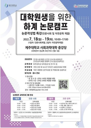 제주대학교는 대학원생들의 논문작성 노하우를 지도하기 위한 '대학원생을 위한 하계 논문캠프'를 진행한다. 논문캠프는 오는 18~19일 이틀간 오전 10~17시 제주대 사회과학대학 중강당에서 진행된다. 교육은 18일 인문사회계열 논문에 신건권 호서대 교수, 19일 자연공학계열 논문에 원병묵 성균관대학교 교수가 학문 계열별 논문작성법과 역량강화 집중 특강으로 진행한다. 제주대 대학원생들과 연구자들은 누구나 참여가능하며 온라인과 현장수강 등이 동시에 가능하다. 참가신청은 오는 15일 오후 4시까지 유알엘 https://naver.me/G8