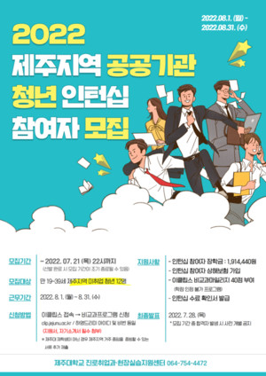 제주대 현장실습지원센터는 '2022년 제주지역 공공기관 청년 인턴십' 참여자를 오는 21일까지 모집한다. 공공기관 청년 인턴십은 제주특별자치도의 지원으로 운영되는 사업으로, 공공분야 취업을 준비하는 만39세 이하 제주지역 청년들이 참여가능하다, 인턴십 기간은 내달 1~ 31일까지며, 6개 공공기관(재외동포재단, 제주관광공사, 제주문화예술재단, 제주에너지공사, 한국국제교류제단, 한국지능정보사회진흥원 NIA 글로벌센터) 업무를 수행하게 된다. 참여 신청은 제주대 대학일자리플러스센터 홈페이지(https://jobcenter.jejunu.