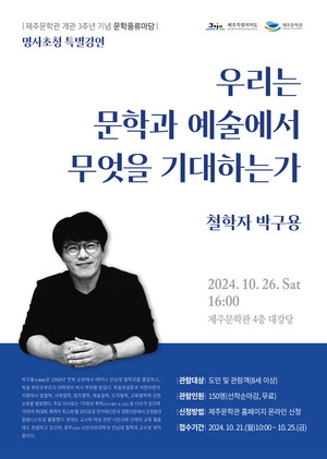 제주문학관, 개관 3주년 철학자 박구용 초청 강연 '제주신화‘'인문학 특강도 문학과 예술의 가치를 심도있게 통찰한다. 제주문학관(관장 김순이)이 개관 3주년을 맞이해, 철학자 박구용 초청 특별강연을 개최한다고 21일 밝혔다. 이번 강연은 ‘우리는 문학과 예술에서 무엇을 기대하는가’를 주제로, 문학과 예술의 가치를 조명한다. 박구용은 문학과 예술에 대한 다양한 관점을 공유해, 참석자들에게 깊이 있는 통찰을 제공할 것으로 기대된다. 같은 날, ‘제주의 신화’를 주제로 제주 인문학 특강도 진행된다. 강연은 김순이 명예관장이 진행하며, 주