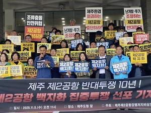 국토교통부가 제주 제2공항 건설계획을 발표한 지 10년째를 맞이하면서 제2공항 반대단체들이 사업 백지화를 위한 집중투쟁을 예고하고 나섰다.제주제2공항강행저지비상도민회의(이하 도민회의)는 5일 제주도청 앞에서 기자회견을 갖고 “제주 제2공항 반대투쟁 10년을 맞아 도민결정권 쟁취와 제2공항 백지화를 위한 집중투쟁을 선포한다”고 밝혔다.도민회의는 “오는 10일이면 제2공항 건설계획이 발표된 지 10년이 된다”면서 “성산읍 신산리 일대에 제2공항이 건설된다는 청천벽력 같은 유스에 가슴이 벌벌 떨렸던 기억은 지금도 생생하다”고 말했다.이어