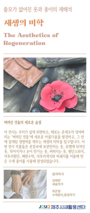 버려지는 것에 예술을 더하는 두 작가가 ‘재생’이라는 주제로 만났다.옷에 새숨을 불어넣는 김태연 작가와 종이로 꽃을 피우는 최은정 작가가 오는 12일까지 제주시새활용센터에서 2인전 을 연다.새숨작가 김태연과 수제종이 작가 최은정은 ‘세계 수선의 날’의 의미를 되새기며 기획된 이번 전시를 통해 버려지는 옷과 종이라는 서로 다른 소재에 새로운 숨결을 불어넣는다.두 작가는 ‘재생’이라는 하나의 주제로 만났다. 김태연 작가는 쓸모가 없어진 웨딩드레스 망사, 오래된 한복, 청바지 등을 해체와 재구성을 통해 동양과 서양의 경계를