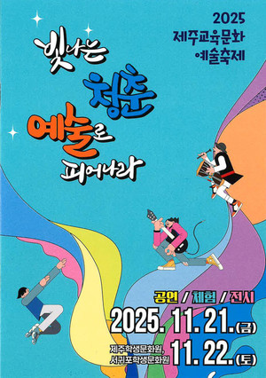 제주도교육청은 오는 21일부터 22일까지 제주시학생문화원과 서귀포시학생문화원에서 ‘2025 제주교육문화예술축제’를 연다고 9일 밝혔다. 올해 축제는 ‘빛나는 청춘, 예술로 피어나라’를 주제로 학생과 교직원이 함께하는 공연·전시·체험의 장으로 꾸며진다.개막식에서는 제주여상 마칭밴드의 ‘오돌또기 행진곡’을 시작으로, 삼양초 윈드오케스트라의 ‘용맹의 비행(Flight of Valor)’, 제주영송학교 앙상블과 중창단의 ‘이웃집 토토로’ OST 연주 등이 무대를 채운다.이틀 동안 도내 초·중·고등학교의 오케스트라, 밴드, 합창단, 뮤지컬·