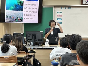 세계문화유산보존사업회(이사장 김택남)와 제주특별자치도가 공동 주최하고 제민일보(대표이사 오홍식)가 후원하는 ‘공동체로 배우는 제주해녀문화 - 불턱 아카데미’가 지난 3일 아라초등학교 4학년 학생들을 대상으로 열렸다. 이날 강연은 오영생 해녀전문가가 맡아 해녀의 삶과 정신을 이해할 수 있는 자리로 꾸몄다.△고대부터 이어진 해녀의 역사“해녀는 언제부터 있었을까요? 아주 옛날, 고구려 문자왕 시절부터 있었어요. 그땐 진주를 캐는 사람들이었죠. 조개 속에서 진주를 꺼내 임금님께 바치던 사람들. 해녀라는 말은 나중에 생긴 거예요”오영생 강사