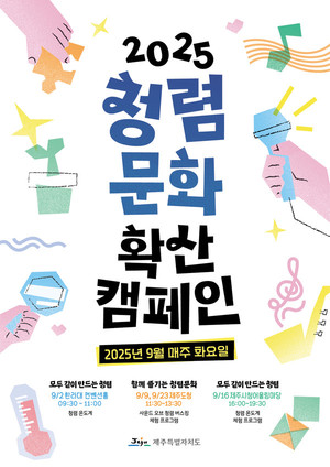 제주특별자치도가 청렴사회 민관협의회와 함께 9월 한 달간 매주 화요일 '청렴문화 확산 캠페인'을 펼친다. 도민에게 청렴 가치를 알리고 생활 속 실천을 확산하려는 취지다.첫 행사는 2일 한라대 컨벤션홀에서 열리는 양성평등주간 기념식과 연계해 청렴 체험부스로 시작한다. 9일과 23일에는 제주도청에서 국민건강보험공단 제주지부와 협력해 청렴버스킹과 체험 프로그램을 진행하고, 16일에는 제주시청 어울림마당에서 제주도교육청·병무청·제주여성가족연구원이 참여하는 다양한 청렴 프로그램이 운영된다.이번 캠페인은 제주도와 양 행정시, 제주도교육청, 국