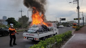 제주시 도로를 달리던 1t 트럭에서 불이 나 운전자가 화상을 입는 사고가 발생했다.4일 제주도소방안전본부에 따르면 이날 오후 4시4분께 제주시 도두2동 인근 도로를 주행하던 1t 트럭에서 화재가 발생했다는 신고가 접수됐다.신고를 받고 출동한 소방대원들은 약 20분 만인 오후 4시25분께 불을 완전히 진화했다.이 사고로 트럭 운전자가 다리에 1도 화상을 입은 것으로 알려졌다. 부상이 심하지 않아 병원으로 이송되지는 않은 것으로 파악됐다.소방당국은 트럭 적재함에서 불이 시작돼 차량 일부를 태운 것으로 보고 정확한 화재 원인을 조사하고