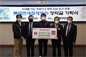 롯데면세점 제주㈜(법인장 김주남)는 최근 제주시 연동주민센터 회의실에서 대한적십자사제주특별자치도지사(회장 오홍식)에 연동지역 취약계층 청소년 지원을 위한 후원금 3000만원을 전달했다.롯데면세점 제주는 연말을 맞아 지역내 소외계층과 코로나19로 어려움을 겪고 있는 소상공인 자녀에게 희망을 전하고자 이번 후원금을 마련했다.제주적십자사는 연동주민센터와 대상자를 선정해 이달 중 장학금을 지원할 예정이다.롯데면세점 제주 관계자는 "코로나19의 어려운 여건에도 불구하고 꿈을 키워나가는 학생들에게 장학금을 전달하게 돼 기쁘다"며 "앞으로도 지