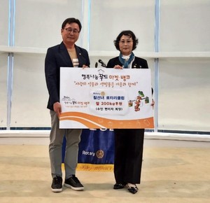 국제로타리3662지구 뉴제주로타리클럽(회장 강대운)은 최근 아젠토피오레 컨벤션 센터에서 회장 이·취임식을 진행하고 사회복지공동모금회를 통해 사회복지법인 선도원 (부설) 벧엘, 아라요양원, 자미성 요앙원에 쌀 1500㎏을 전달했다.