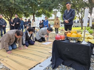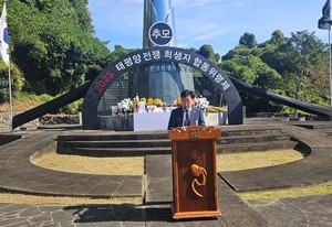 80여년 전 일제가 일으킨 태평양전쟁의 최전선으로 내몰리며 유명을 달리한 제주 출신 희생자들의 넋을 위로하고 평화의 가치를 되새기기 위한 합동위령제가 열렸다.태평양전쟁희생자유족회 제주도지부는 30일 서귀포시 대포동 약천사 경내 위령탑에서 오영훈 지사, 김원칠 서귀포시 부시장, 하성용 제주도의원, 유족회 회원과 유가족 등 100여명이 참석한 가운데 2025년도 태평양전쟁 희생자 합동위령제를 개최했다.이날 위령제는 입제선언과 초혼문 낭독을 시작으로 헌화 및 분향, 경과보고, 주제사, 추도사 순으로 진행됐다.강덕림 지부장은 주제사에서 "