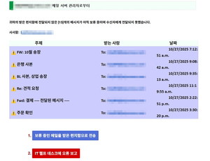 제주시에 거주하는 직장인 A씨(42)는 최근 이상한 내용의 이메일을 받았다. 자신이 업무용으로 사용하는 메일함으로 발송됐어야 할 메시지들이 보류 중인 상태로 남아있어 확인하라는 내용이었다.메일 내용에는 ‘10월 송장’, ‘은행 사본’, ‘견적 요청’, ‘주문 확인’ 등의 제목의 메일들이 표시돼 있었고 그 밑으로는 발송 보류된 메일들을 자신의 편지함으로 전송하거나 헬프 데스크에 오류를 보고하는 선택항목이 표시돼 있었다.A씨는 “메일 발송 오류는 얼마든지 발생할 수 있기는 하지만 메일 제목들이 제가 하던 업무들과는 전혀 관계가 없는 것