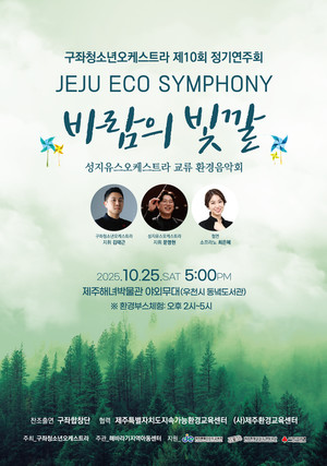구좌청소년오케스트라는 오는 25일 오후 5시 제주해녀박물관 야외무대에서 제10회 정기연주회 'JEJU ECO SYMPHONY - 바람의 빛깔'을 공연한다.이번 공연은 성지유스오케스트라 함께 이뤄지는 환경 주제 음악회로, 구좌합창단과 소프라노 최은혜가 협연할 예정이다.25일 오후 2시부터 오후 5시까지 제주도지속가능환경교육센터와 ㈔제주환경교육센터 등 환경 관련 기관 및 단체가 참여해 생태 감수성 향상, 청소년간 문화교류, 지역공동체 연계 등 다양한 체험활동이 가능한 환경 교육 부스를 운영한다.한편 이번 음악회는 제주도교육청, 제주도개