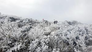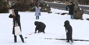 완연한 봄인 4월 중순 한라산에 대설특보가 발효되는 등 많은 눈이 내리면서 겨울 풍경을 연출했다.제주지방기상청은 12일 오후 3시 30분을 기해 제주도 산지에 대설주의보를 내렸다.이날 오후 6시 현재 적설량은 한라산 윗세오름 23.4㎝, 진달래밭 22.8㎝, 어리목 13㎝ 등을 기록했다.기상청은 13일 아침까지 산간에 5~10㎝, 많은 곳은 20㎝ 이상의 눈이 더 내릴 것으로 예상했다.한라산에 많은 눈이 쌓이면서 이날 오후 6시 현재 1100도로는 차량 운행이 전면 통제된 상태다.해안지역은 13일 아침까지 비가 계속될 것으로 전망됐