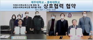 제주대학교(총장 송석언)와 충북대학교(총장 김수갑)는 지난달 29일 화상회의를 통해 미래수의학교육시스템 확립과 유럽수의학교육인증(EAEVE) 획득을 위한 업무협약을 체결했다.양 대학은 협약을 통해 △강의·실험 실습시설의 공동 활용 △공동교육·교과목의 개발 및 운영 △수의임상실습관련 동물 진료시설의 공동 활용에 상호 협력하기로 했다. 또 △학기와 방학기간동안 교수 및 학생 교류 활성화 △미래수의학교육 시설의 공동개발 및 활용 △미래수의학교육시스템을 위한 대학시설의 공동 활용 △공동학위제도의 운영 등을 추진한다. 송석언 제주대 총장은