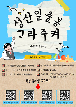 제주특별자치도 세계유산본부가 세계자연유산 성산일출봉의 가치를 온 가족이 함께 체험할 수 있는 특별한 프로그램을 선보인다.세계유산본부는 2025년 세계유산 활용 프로그램 ‘성산일출봉 ᄀᆞ라주켜’두 번째 행사를 오는 23일 성산일출봉 수마포 해안에서 운영한다.이번 프로그램은 세계자연유산 성산일출봉의 생태적·지질학적 가치를 체험을 통해 전달하고, 어린이들에게 세계유산 보존의 중요성과 긍정적 인식을 심어주는 것을 목표로 기획됐다.프로그램은 성산일출봉 수마포 해안에서 총 4회(8월2일, 8월23일 9월6일, 10월18일)에 걸쳐 사전예약제로