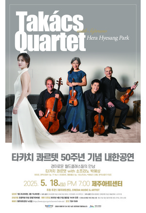 제주아트센터는 다음달 18일 오후 7시 '타카치 콰르텟 with 박혜상'을 무대에 올린다고 밝혔다.이번 공연은 현악사중주단 타카치 콰르텟의 창단 50주년을 맞아 진행되는 것으로, 소프라노 박혜상이 함께한다.공연은 하이든의 '현악사중주 op.77 No.1' 힌데미트의 '멜랑콜리' 라벨의 '현악사중주 F장조' 등으로 꾸며진다.관람료는 1층 2만원, 2층 1만5000원이다. 입장권은 제주아트센터 홈페이지를 통해 예매 가능하다.