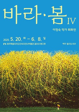 제주의 자연과 일상을 바느질하듯 풀어낸 회화작품들이 제주 민속자연사박물관 갤러리 벵디왓을 채운다.민속자연사박물관은 이정숙 작가의 개인전 ‘바라·봄 Ⅳ’가 20일부터 다음달 8일까지 박물관 내 갤러리 벵디왓에서 열린다고 19일 밝혔다.전시는 매주 월요일 휴관하며, 제주의 자연을 주제로 한 회화 작품 20여점이 전시된다.이번 전시에는 눈부시게 피어난 개나리, 유채밭 사이의 밭담길 등 제주 풍경을 두터운 질감의 붓질로 표현한 작품들이 소개된다. 바느질하듯 정성스럽게 채워진 화면은 자연의 생명력과 치유의 메시지를 관람객에게 전한다.이정숙