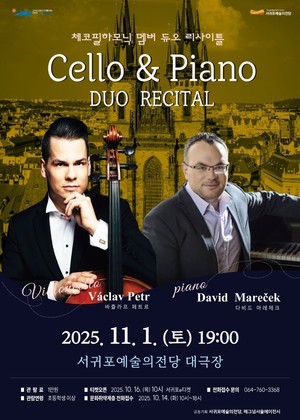 서귀포시는 11월 1일 오후 7시, 서귀포예술의전당 대극장에서 체코필하모닉오케스트라 멤버 '첼로·피아노 듀오 리사이틀'을 개최한다고 밝혔다.이번 공연은 제주도민과 관광객들에게 수준 높은 클래식 음악을 감상할 수 있는 기회를 제공하기 위해 마련됐다.또한 이번 리사이틀에는 체코 필하모닉 오케스트라의 최연소 수석 첼리스트 출신 바츨라프 페트르(Vaclav Petr)와 오케스트라 단장 겸 피아니스트 다비드 마레체크(David Marecek)가 출연한다.바츨라프 페트르는 프라하 봄 국제 콩쿠르 우승 등 세계 유수의 무대에서 활약한 첼리스트이