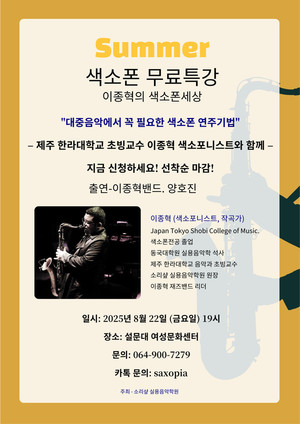 제주한라대학교 초빙교수이자 색소포니스트·작곡가인 이종혁 교수가 오는 22일 오후 7시, 설문대여성문화센터에서 제주도민을 위한 무료 특강을 진행한다. '대중음악에서 꼭 필요한 색소폰 연주기법'을 주제로 진행되는 이번 특강은 색소폰을 취미로 연주하는 도민들에게 대중음악 무대에서 바로 활용할 수 있는 실용적인 연주기법을 전수한다.특히 현재 도내 색소폰 교육은 대부분 클래식 중심으로 이뤄지고 있는 반면, 이번 특강은 재즈·팝·발라드 등 실제 공연과 연주 현장에서 필요한 기법을 배우는 기회를 제공할 것으로 기대되고 있다.Tokyo Shobi