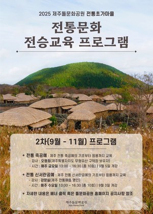 제주특별자치도 돌문화공원관리소(소장 김동희)는 9월부터 11월까지 공원 내 전통초가마을(돌한마을)에서 ‘2025년 하반기 전통문화 전승교육 프로그램’을 운영한다.이번 교육은 제주의 정체성이 담긴 전통 문화유산에 대한 이해를 증진하고 지속적인 전승 기회를 제공하기 위해 마련, 돌문화공원 내 전통초가마을(돌한마을)에서 각 분야 명장들을 초빙해 진행된다.하반기에는 △죽공예와 △신서란공예 프로그램이 진행된다. 죽공예는 오영희 죽공예 명장이 대나무 베기, 자르기, 다듬기, 짜기 등 전통 죽공예 기법을 전수한다. 신서란 공예는 강문실 전통매듭