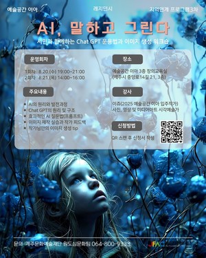 제주문화예술재단(이사장 김석윤, 이하 재단)은 오는 20·21일 양일간 예술공간 이아 3층 창의교육실에서 시민을 대상으로 한 창작 프로그램 ‘AI 말하고 그린다–시민과 함께하는 AI 이야기’를 운영한다.이번 프로그램은 미디어아트 시각예술가이자 예술공간 이아 레지던시 입주작가 이쥬가 진행하는 지역 연계 프로그램의 일환으로, 대화형 AI와 이미지 생성형 AI를 직접 체험하며 창의적 표현을 확장하는 실습형 워크숍이다.주요 내용은 △AI의 원리와 역사 이해 △효과적인 AI 질문법 실습 △이미지 생성형 AI 서비스 활용법 △프롬프트 작성 실