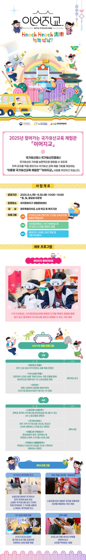 저지문화지구 생활문화센터(운영기관 제주문화예술재단)는 ‘2025년 찾아가는 국가유산교육 체험관(이하 이어지교)’에 참여할 참여기관을 오는 22일까지 모집한다.국가유산청이 주최하고 국가유산진흥원이 주관하는 ‘이어지교’는 신체적·지리적·경제적 제약으로 국가유산을 접하기 어려운 사회적 약자와 지역민을 위해 2020년부터 추진해 온 대표 교육·체험 프로그램이다.프로그램은 9월 4~30일 제주도 저지문화지구 생활문화센터에서 진행되며, 모집 대상은 제주도 소재의 초·중등학교 및 복지기관이다.참여기관의 학생들과 지역 주민들은 AR(증강현실)·V