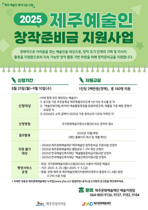 제주특별자치도와 제주문화예술재단(이사장 김석윤)은 도내 예술인의 창작 활동 기반 마련을 위해 예술인 창작준비금을 지원한다.창작준비금 지원사업은 열악한 창작 여건을 개선하고, 지속 가능한 정착 기반을 마련하기 위한 사업으로, 예술인 1인당 200만 원을 지원한다.지원 대상은 △공고일 기준 주민등록상 제주특별자치도에 1년 이상 주소를 둔 예술인 △예술인복지법상 예술활동증명을 완료한 예술인 △2024년 소득인정액이 당해 연도 기준 중위소득 120% 이하인 예술인이다.신청 기간은 8월 20일부터 9월 10일까지이며, 국가문화예술지원시스템(