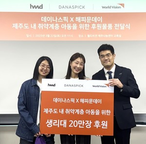 ㈜다영에이치앤비(대표 데이나)와 해피문데이(대표 김도진)는 월드비전(제주나눔센터장 강동균)에 22일 생리대 20만장 전달식을 가졌다. 이번 후원은 ㈜다영에이치앤비와 해피문데이가 함께 협력해 생리대 총 20만448장을 월드비전 제주나눔센터에 전달했으며, 후원물품은 제주특별자치도사회복지협의회를 통해 도내 취약계층 아동 및 청소년들에게 지원될 예정이다. ㈜다영에이치앤비 대표 데이나는 SNS에서 인플루언서로 활발히 활동하며 팬들과 함께 소통하는 다양한 이벤트를 통해 자신의 선한 영향력을 지역사회에 전하기 위한 나눔활동을 적극적으로 실천하고