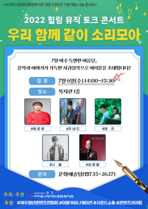 서귀포시장애인종합복지관(관장 윤보철)은 복지관 개관 23주년을 맞아 오는 6일 오후 2시 '2022 힐링 뮤직 토크 콘서트-우리 함께 같이 소리모아'를 개최한다.이번 콘서트는 제주에서 활동하고 있는 싱어송라이터 류준영씨를 비롯해 주낸드, 메리, 너울 등과 제주를 대표하는 장애문화예술인 팜음악가수 김원필씨가 재능 기부 형태로 참여한다. 문의=064-735-2627.