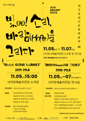 5일~17일 서귀포에서 제주장애인문화예술제 제주에이블아트페스타 장애, 비장애인간 예술적 통합이 이뤄진다. 서귀포시장애인종합복지관(관장 윤보철)은 5일부터 17일까지 서귀포예술의전당 소극장과 전시실에서 '2024제주장애인문화예술제-제주에이블아트페스타 '빛(光)! 소리, 바람(Hope)을 그리다'를 개최한다고 4일 밝혔다. 이번 행사는 제주특별자치도가 지원하고 콘텐츠라이팅이 후원한다. 행사에서는 예비문화예술창작자와 에이블아티스트 공연의 장을 비롯, 예비 작가들이 각자의 꿈을 표현한 창작 작품을 선보인다. 이를 통해, 도내장애인문화예술