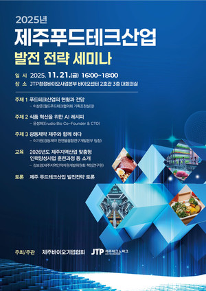 제주테크노파크(원장 지영흔, JTP)는 제주바이오기업협회(회장 김성후)와 함께 오는 21일 오후 4시 JTP 청정바이오사업본부 바이오센터 2호관 3층 대회의실에서 '제주 푸드테크 산업 생태계 조성 및 활성화'를 주제로 2025년 제주푸드테크산업 발전 전략 세미나를 개최한다.이번 세미나는 최근 인공지능(AI), 로봇기술 등 디지털 기술이 식품산업 전반에 접목되는 푸드테크(Food Tech) 산업이 확산됨에 따라 제주지역 식품산업 경쟁력 제고와 신산업 창출 대응방안을 모색하기 위해 마련됐다.주제발표는 이상준 월드푸드테크협의회 기획조정실