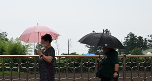 연일 이어진 무더운 날씨를 식혀주는 비가 내린 17일 제주시 애월읍 마을에서는 주민들이 우산을 쓰고 거닐고 있다. 김용현 기자