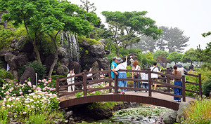 장맛비가 내리다 소강상태를 보인 지난 주말 제주시 구좌읍 송당리에 위치한 동화마을에 관광객과 도민들이 찾아 활짝 핀 수국과 수련 등을 보며 제주여행을 즐기고 있다. 김용현 기자