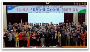 고산농협(고영찬 조합장)과 경기 광명농협(이병익 조합장)은 도농상생 자매결연 조합을 맺고 지난 24일부터 25일까지 2틀간 농협안성교육원(원장 김현석)에서 실시하는 2019년 대의원 과정 교육을 수강했다.