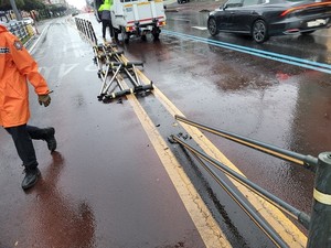 제주지역 추석 연휴 첫날 궂은 날씨로 곳곳에서 피해가 잇따르고 있다. 3일 현재 제주도에는 추자도와 제주도 북부를 제외한 전역에 호우 특보가 발효 중인 가운데 비구름대의 영향으로 시간당 50㎜ 이상의 매우 강한 비가 내리고 있다.이날 기상청에 따르면 오후 3시20분 기준 주요 지점 누적 강수량 현황(2~3일)은 진달래밭 100.0㎜, 성판악 99.5㎜, 한라산 남벽 86.0㎜, 영실 69.5㎜ 등에 달한다.이 밖에도 한남 79.0㎜, 가시리 75.0㎜, 성산 수산 69.5㎜, 마라도 69.0㎜, 가파도 60.5㎜, 서귀포 59.2㎜