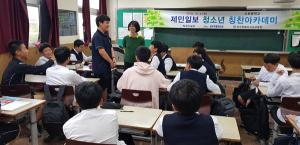 제민일보·도 주최…김미리 가정위탁지원센터 강사좋은 점을 보려는 노력, 진심을 담은 칭찬·배려 강조"관계란 주고 받는 것…마음에 미덕 채우고 나눠야"제민일보사(대표이사 사장 김영진)와 제주특별자치도가 공동 주최하는 '2018 찾아가는 청소년 칭찬아카데미'가 10일 제주중앙고등학교 2학년 학생들을 대상으로 열렸다. 이날 칭찬아카데미에서 강사로 나선 김미리 제주가정위탁지원센터 사무국장은 세심한 관찰을 통한 칭찬의 중요성과 '먼저 웃어주기' 등 주변 사람들과 좋은 관계를 유지하는 방