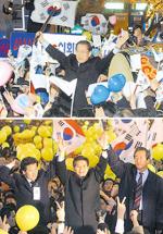 선거운동 마지막날인 18일 이회창 후보(사진 위)와 노무현 후보가 서울 명동에서 유세를 잇따라 열고 지지를 열고 지지를 호소하고 있다.