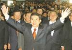 제16대 대통령 선거에서 당선된 민주당 노무현 후보가 19일 밤 여의도 당사에서 당직자들과 함께 국민들에게 인사하고 있다.