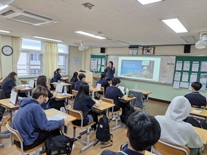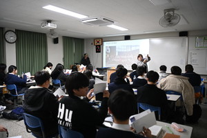 세계문화유산보존사업회(이사장 김택남)와 제주특별자치도가 개최하고 제민일보(대표이사 오홍식)가 후원하는 '공동체로 배우는 제주해녀문화 - 불턱 아카데미'가 지난 11월 27일 영주고등학교 1학년 6반 학생들을 대상으로 진행됐다. 불턱 아카데미는 2024년 제주해녀문화 가치 활성화 사업의 일환으로, 도내 청소년들이 유네스코 인류무형문화유산으로 지정된 제주해녀 문화의 가치를 보다 구체적으로 알아보고, 제주 해녀문화를 잘 모르는 젊은 세대와 후대에 알리기 위해 마련됐다.△제주해녀의 역사이날 불턱 아카데미는 김하영 강사(제주해녀박물관 위원)