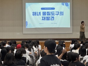 세계문화유산보존사업회(이사장 김택남)와 제주특별자치도가 공동 주최하고 제민일보(대표이사 오홍식)가 후원하는 '공동체로 배우는 제주해녀문화 - 불턱 아카데미'가 지난 9일 제주동여자중학교 1학년 학생들을 대상으로 열렸다. 김하영 강사(제주해녀박물관 위원)가 진행하는 이번 불턱 아카데미는 유네스코 인류무형문화유산으로 등재된 제주 해녀문화의 가치를 알리고 청소년들에게 해녀의 물질 문화와 역사를 알리기 위해 마련됐다. △제주 해녀의 물질 문화"해녀는 반드시 벗이 있어야만 물에 들어갈 수 있어요"김하영 강사는 해녀의 공동체 문화로 강의를 시